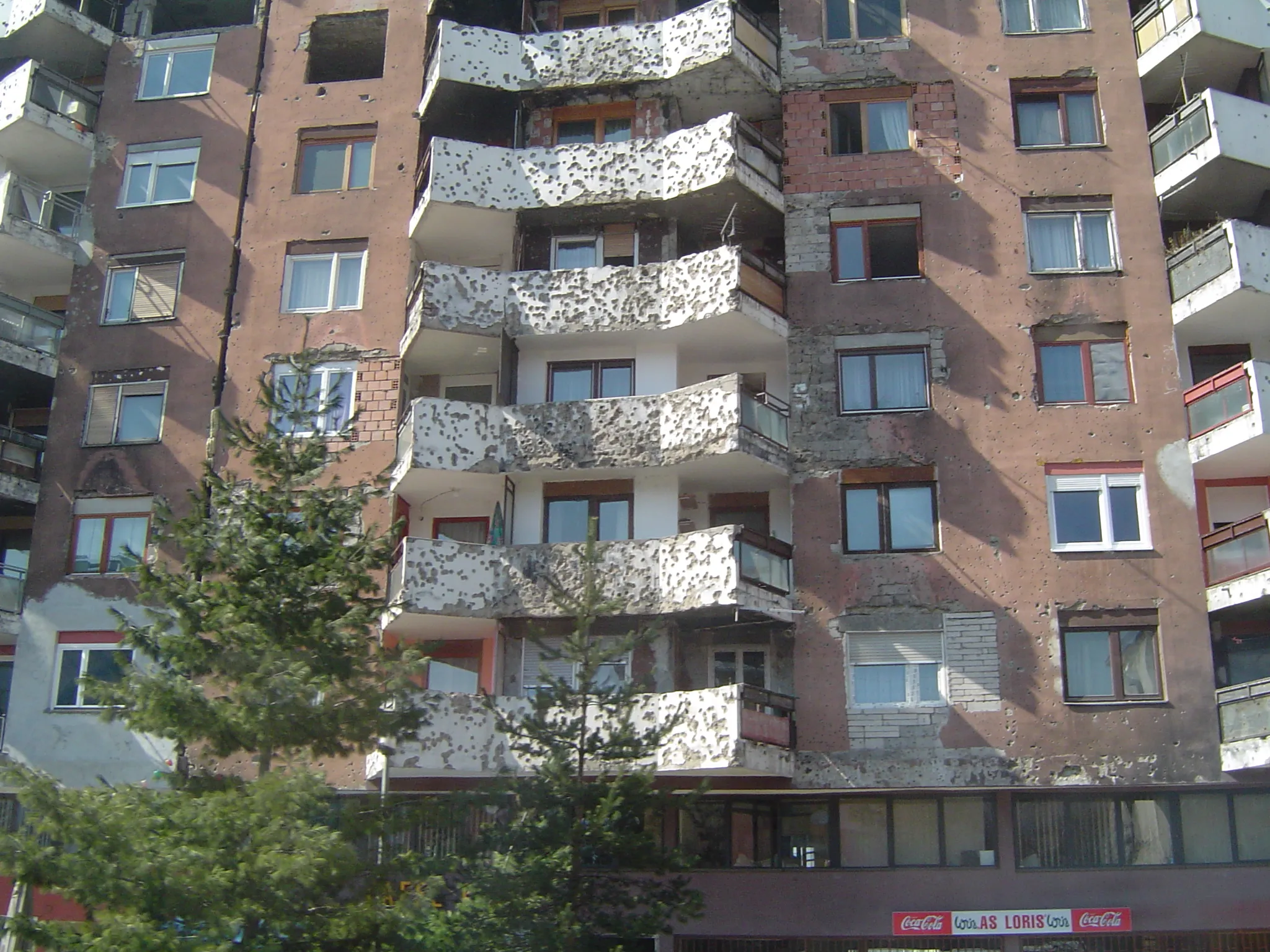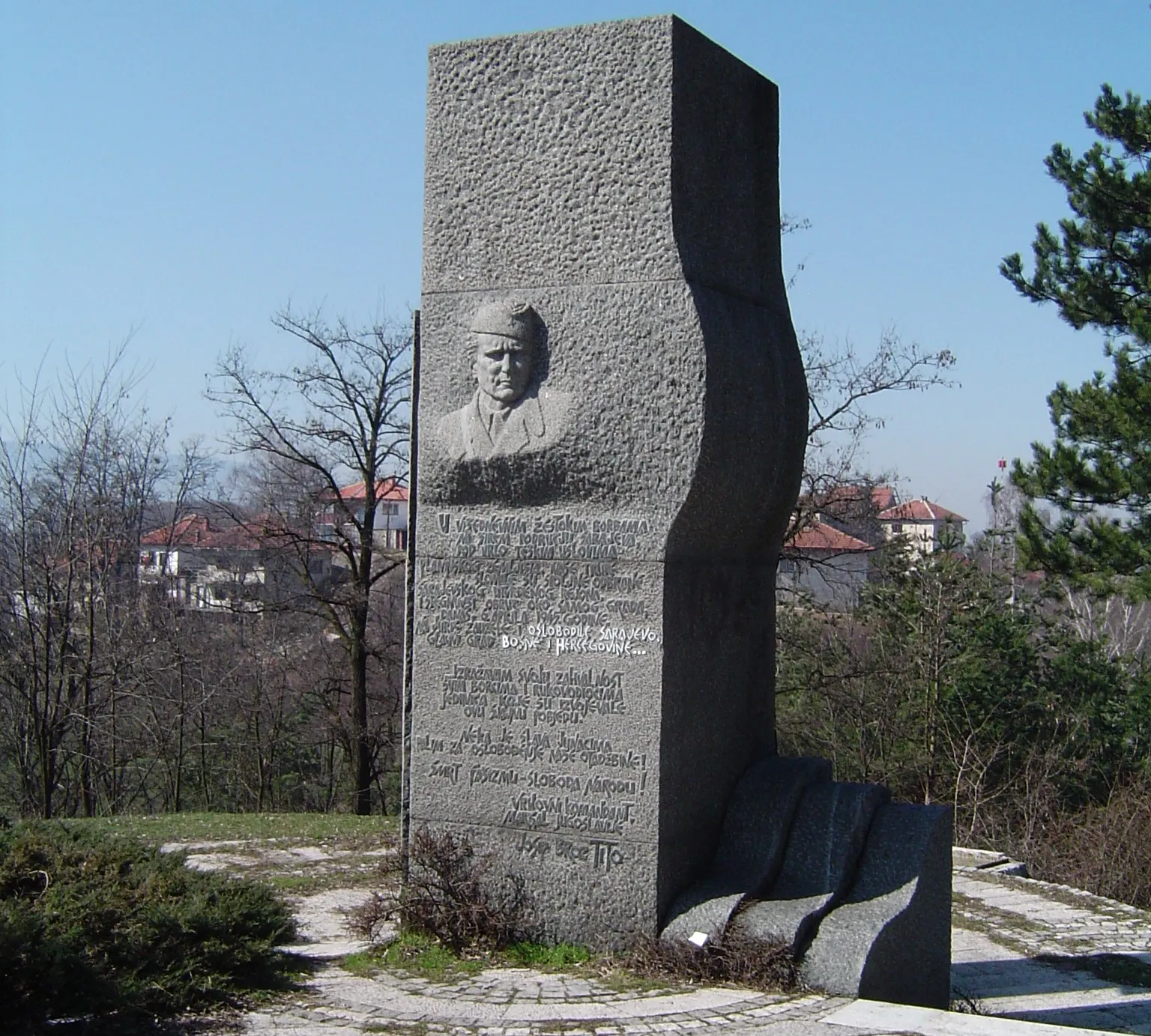 SFOR, OP PALLADIUM, ROTO13, Groupement tactique du RCD, automne 2003 au printemps 2004. Monument aux morts. Le 32e peloton à Sarajevo, à l'ancien QG nazi.