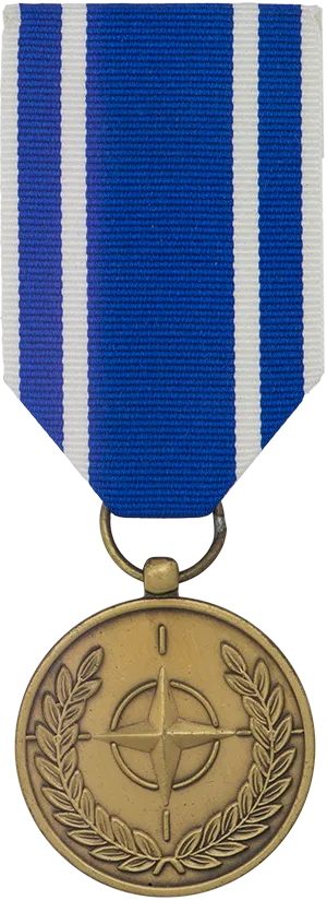 The ribbon is dark blue, the colour of NATO with four white stripes, two on either end, representing peace. The tour numerals are Arabic script and made of bronze.