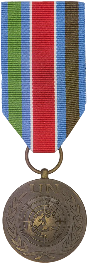The ribbon consists of a background of UN blue, with a central wide band of red, representing the United Nations Protected Areas (UNPAs), flanked by thin stripes of white. On the left side there is a narrow band of green, representing forests, and on the right side, a narrow band of brown, representing the mountains.