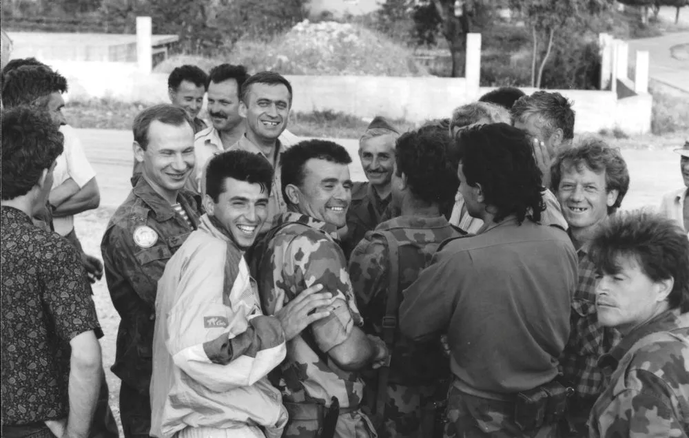 MGen Kotil (smiling in centre) surrounded by Serb soldiers, Kakma
