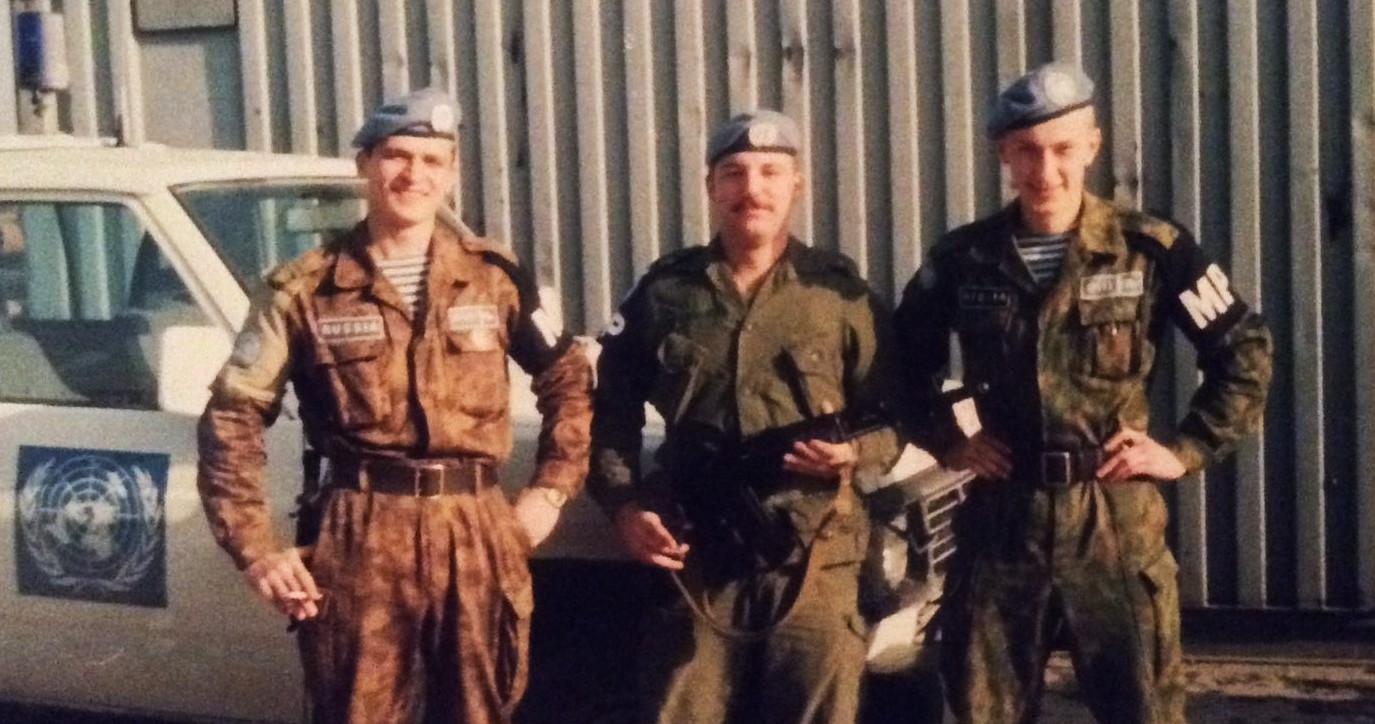 Yves Lagueux, UNPROFOR 92-93 UNHQ, UNMP, West Sector with 2 Russian MP near Vukuvar, Croatia.