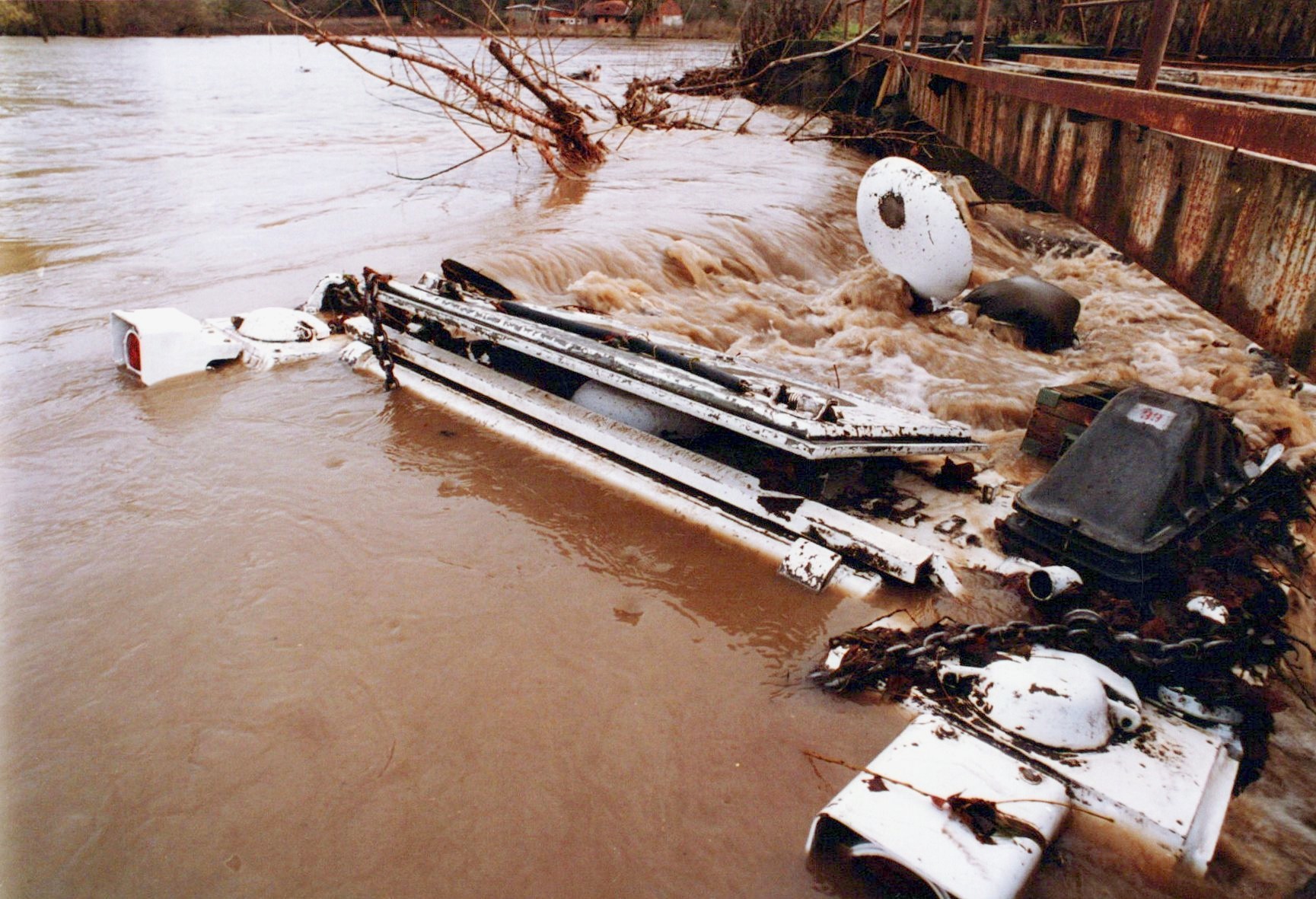 Trying to pull out an APC from the creek - stuck under the bridge.